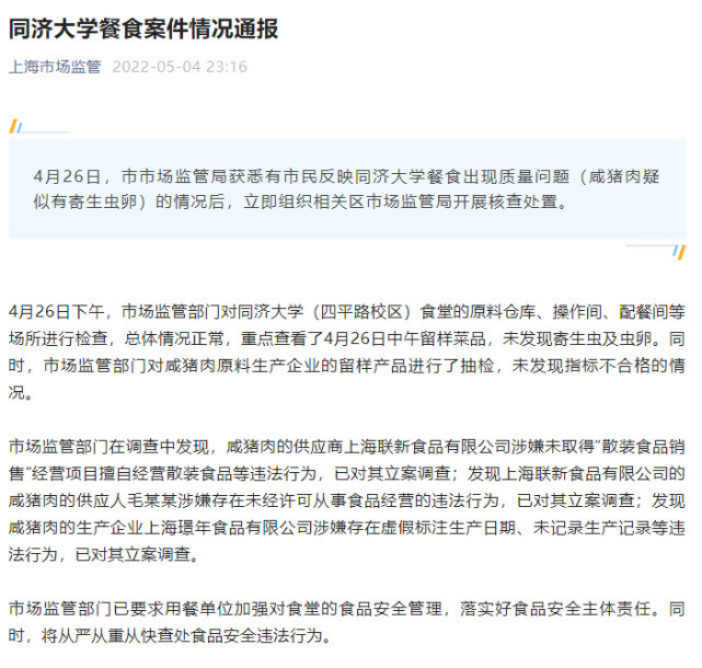上海市市场监督管理局5月4日晚通报称,4月26日,市场监管局获悉有市民反映同济大学餐食出现质量问题(咸猪肉疑似有寄生虫卵)的情况后,立即组织相关区市场监管局开展核查处置。